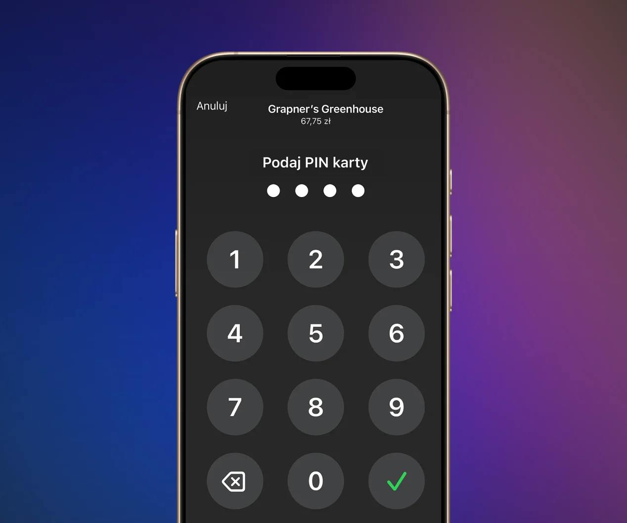 Jeśli transakcja będzie wymagać kodu PIN, Tap to Pay na iPhonie automatycznie wyświetli ekran do jego wprowadzenia. Wraz z jego wyświetleniem, funkcja Tap to Pay na iPhonie uniemożliwi opcję odczytu w aplikacjach działających w tle, które mogłyby przechwycić jakąkolwiek część kodu PIN. Podczas przetwarzania płatności funkcja Tap to Pay na iPhonie blokuje wszystkie narzędzia do robienia zdjęć, filmów oraz zrzutów i nagrywania ekranu, które działają na urządzeniu używanym do sprzedaży, żeby zapobiec przechwyceniu kodu PIN lub numeru karty płatniczej obsługiwanej osoby.